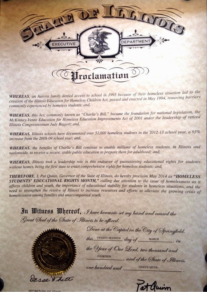 Homeless Students’ Educational Rights Month, signed by Illinois Governor Pat Quinn.